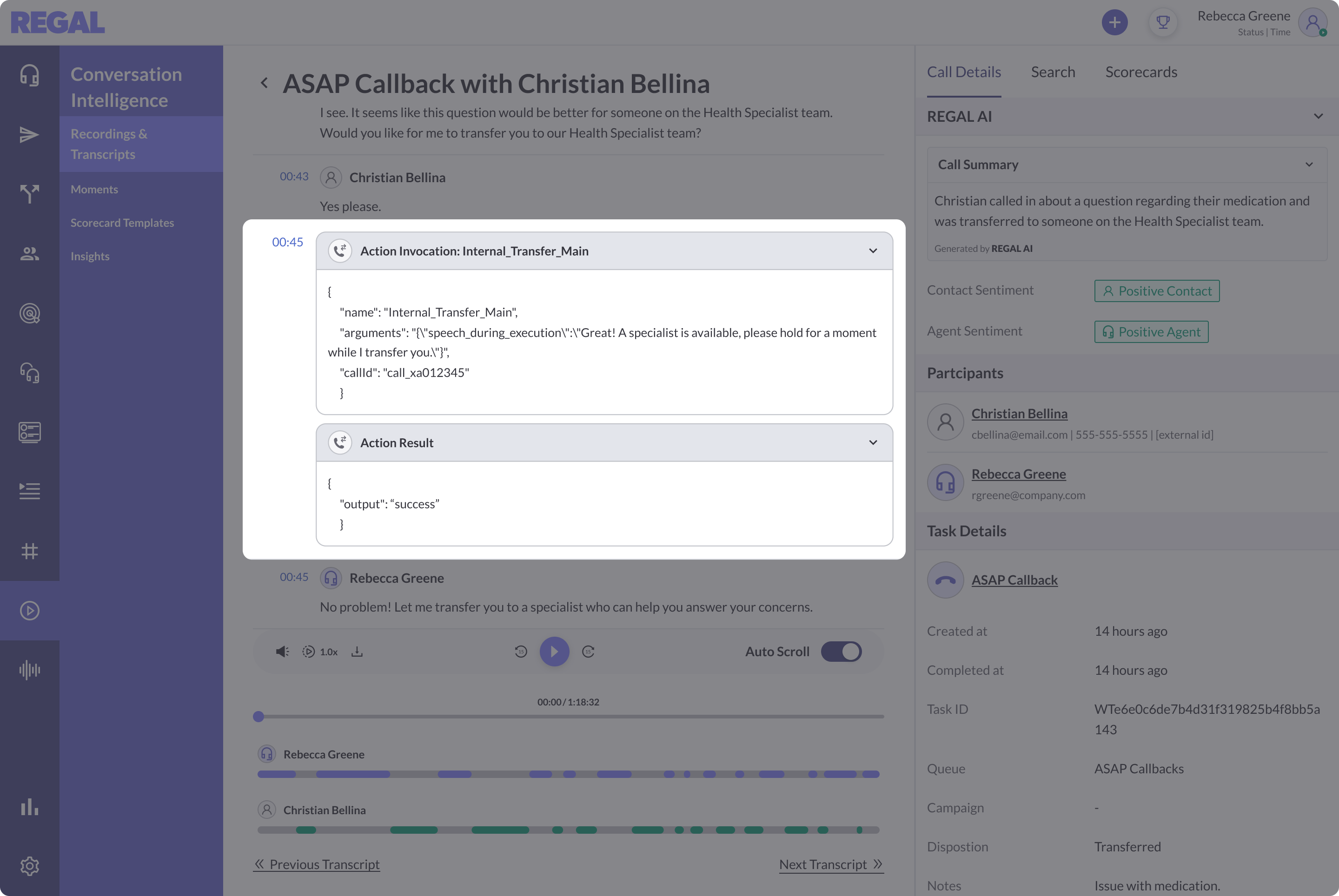 With Conversation Intelligence, you can access a detailed and auditable view of your call conversations in the Regal app. Once enabled, a new tab will appear in the main left navigation menu, called “Conversation Intelligence”