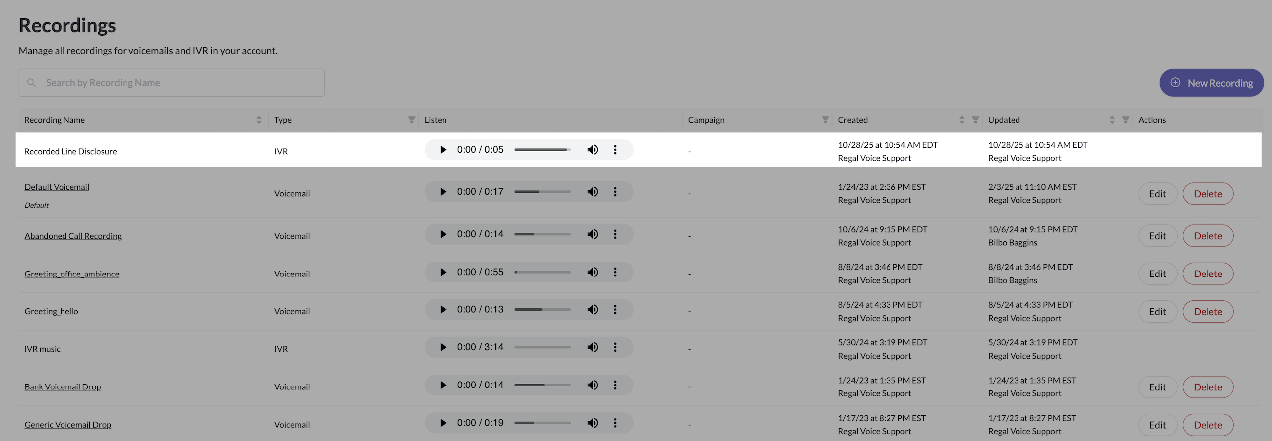 With Regal's Call Compliance Auto-Announcements, you can set up a recording to automatically play at the start of outbound calls. This ensures that the necessary announcements (e.g., recording disclosures, compliance messages) are communicated to customers without relying on agents remembering to say them manually. Note: Agents can always choose to Pause Recording on calls as needed.