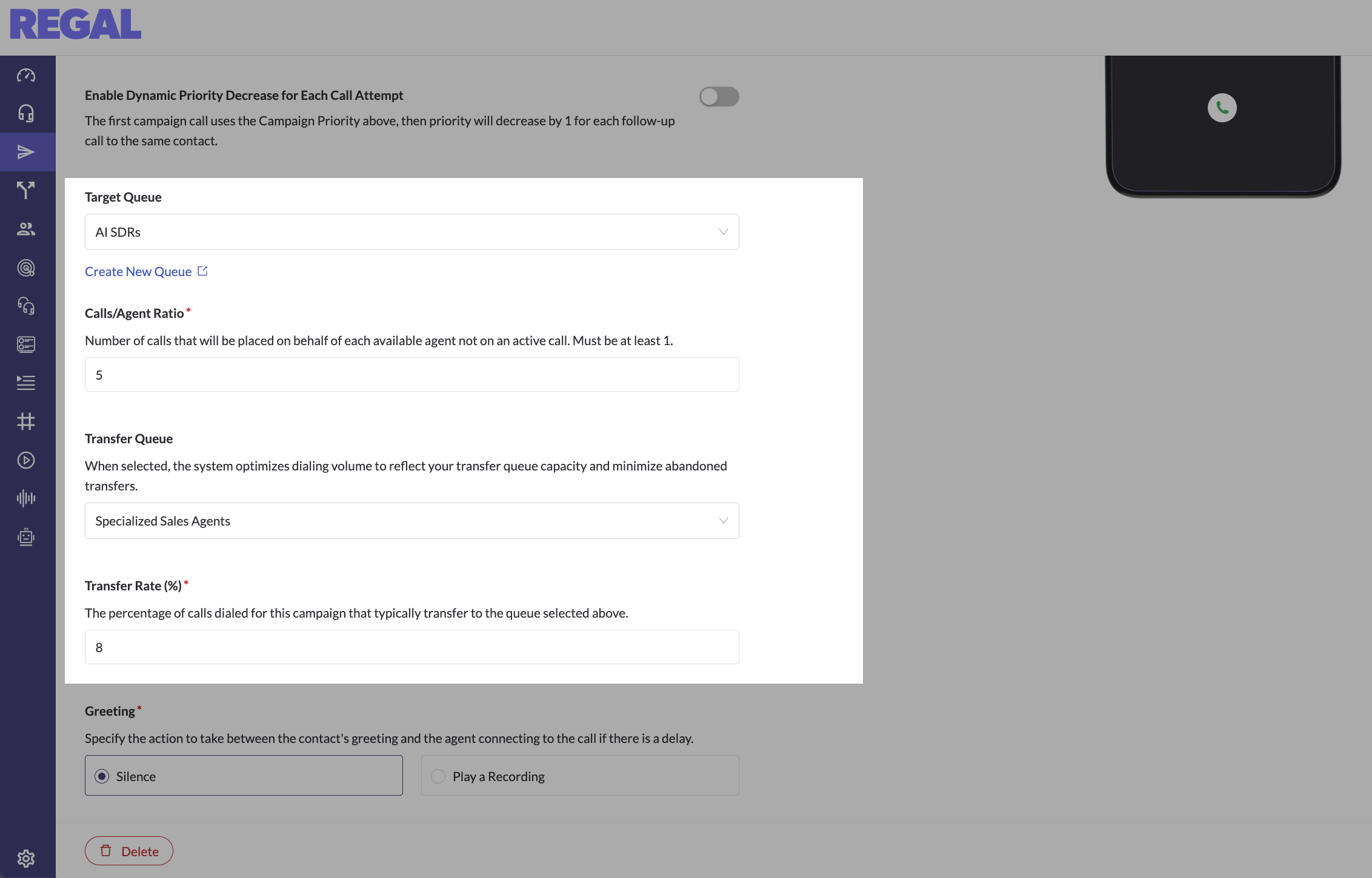 - Select your Transfer Rate: the static input of the expected rate of transfers out of calls dialed for this campaign.