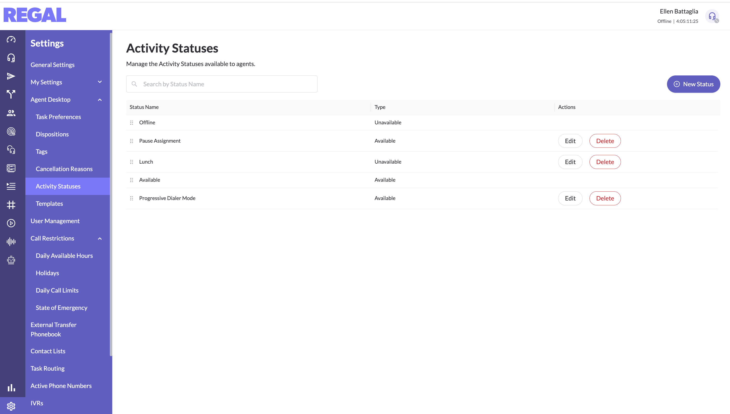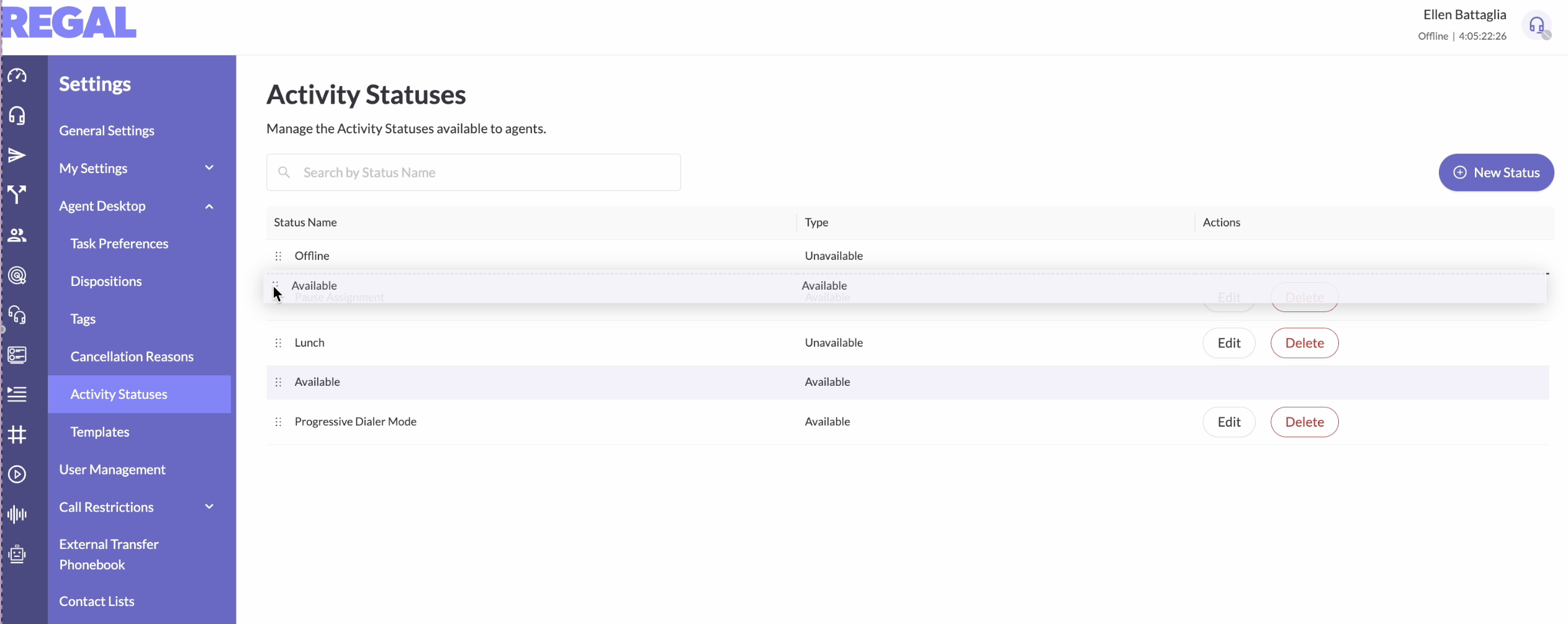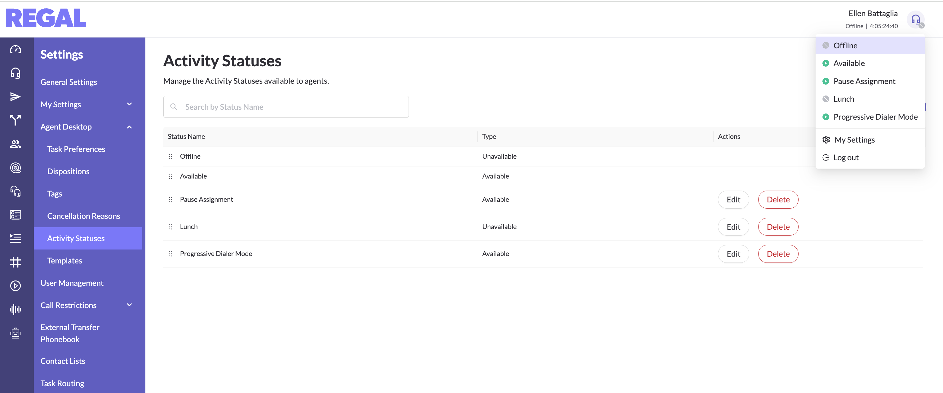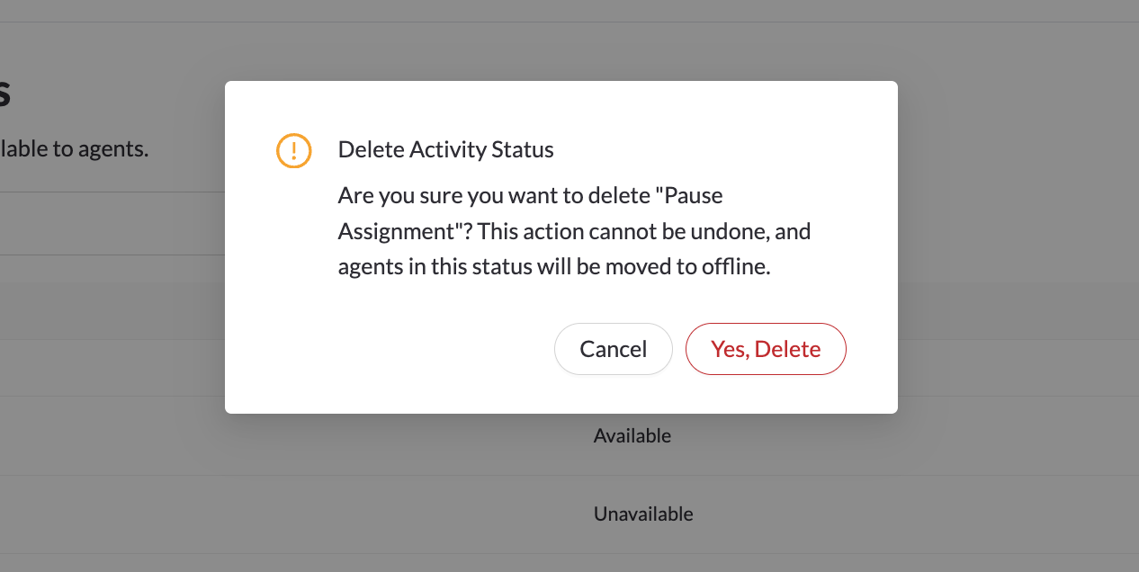 Admins can delete statuses by clicking the "Delete" button in the row. When a status is deleted, it will be removed from the Activity Status dropdown on the Agent Desktop for agents to select. Any agents actively in that status will be removed to offline, and no longer able to select the deleted status.