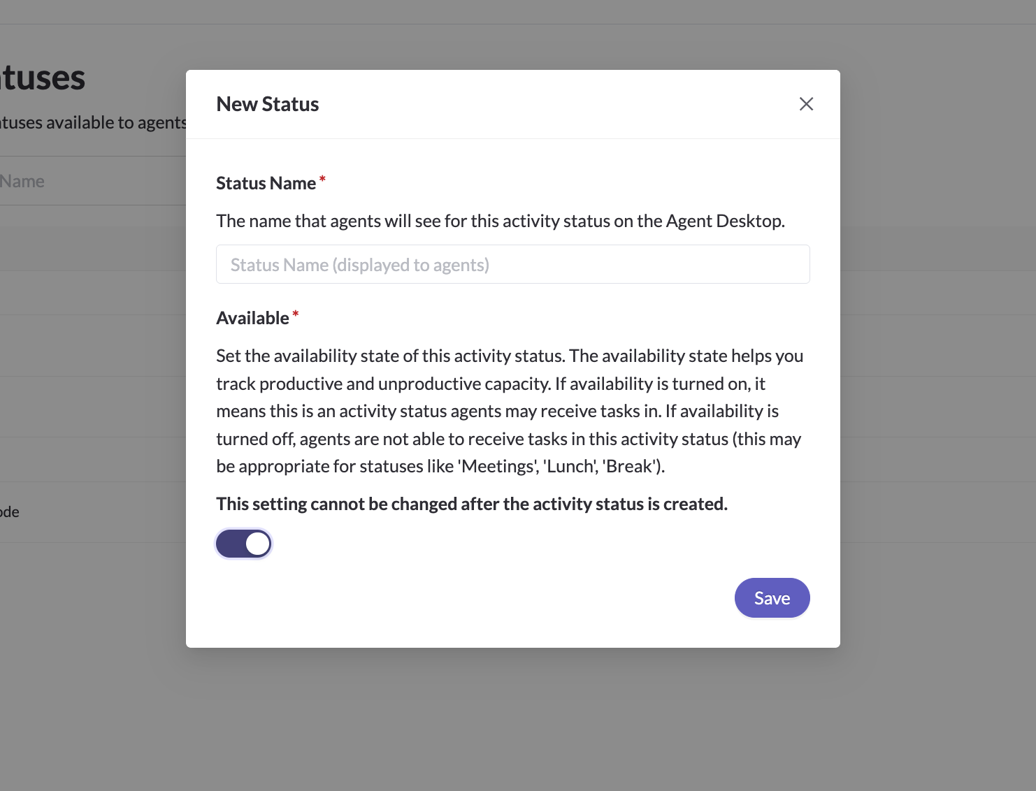 To create a new status, click the "New Status" button at the top right of the page. Then enter what you'd like the status to be called, and select whether the status is an Available status. Available statuses are statuses within which agents can receive tasks. If availability is turned off, agents are not able to receive tasks in this status (this may be appropriate for statuses like 'Meetings', 'Lunch', 'Break'). You cannot change this setting once the status has been created.