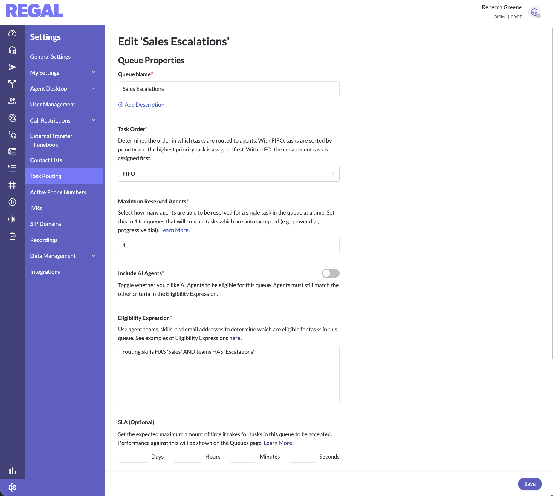 Set a Service Level Agreement (SLA) for each of your queues. The SLA defines the target time interval between when the task is created and when the task is accepted. For example, if you are targeting answering inbound calls within 30 seconds, then you'd set the SLA for your Inbound Call queue to 30 seconds.