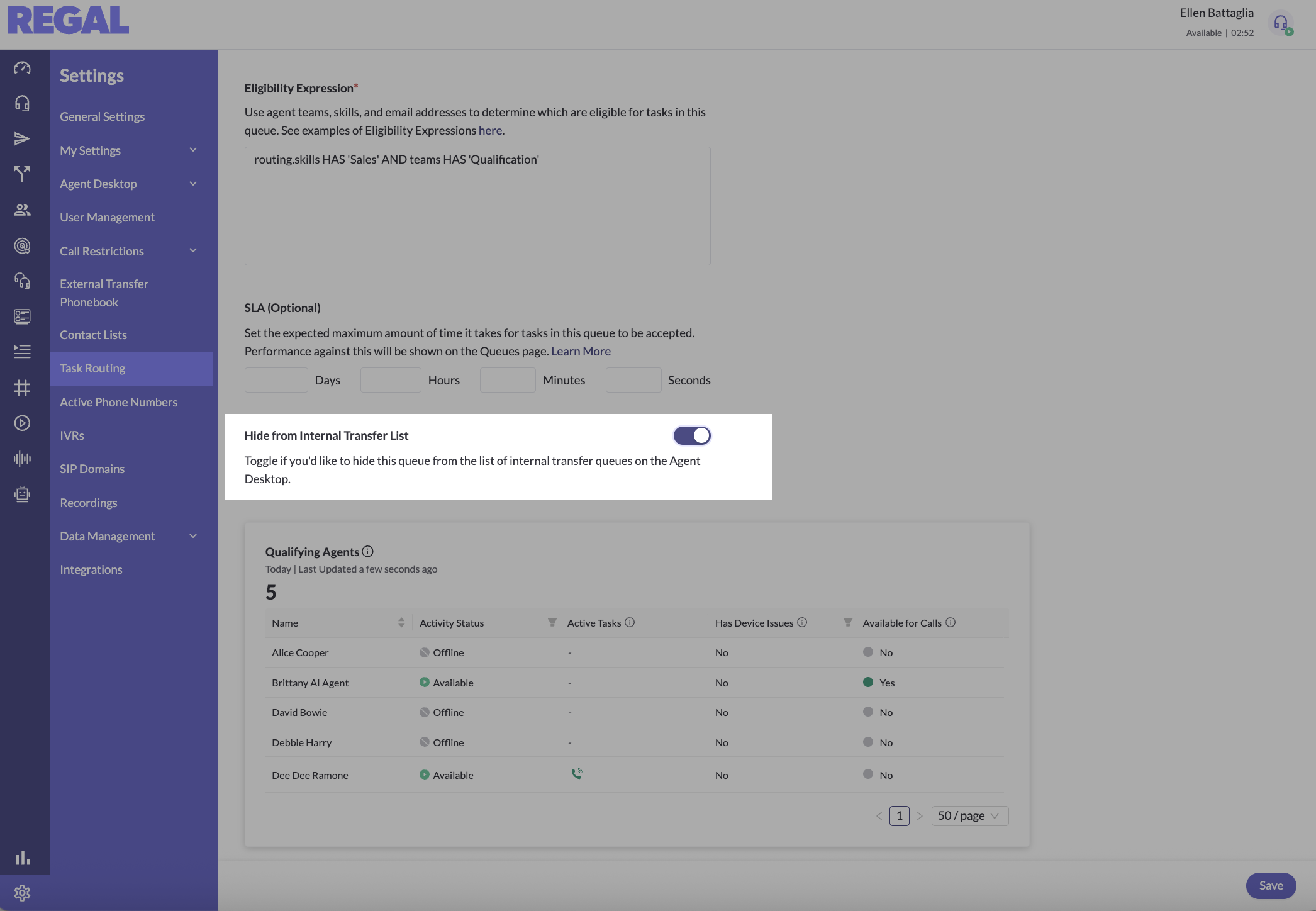 If a queue is not relevant for agents to be transferring calls into, you can choose to hide the queue from the Internal Transfer dropdown on the Agent Desktop. This is useful to prevent agents from accidentally transferring to irrelevant queues.