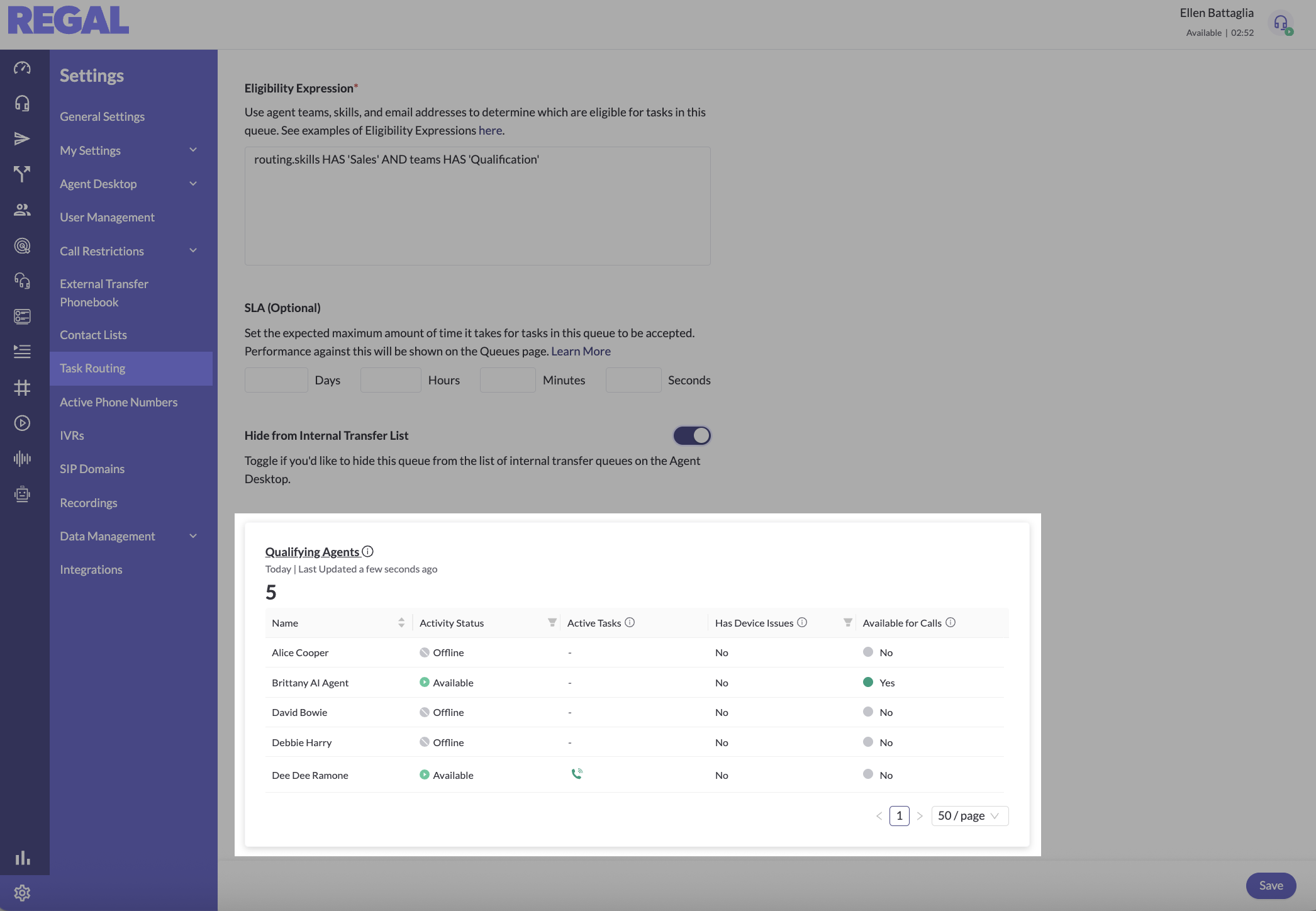 At the bottom of the page (once saved), you can view the agents that match your last-saved Eligibility Expression in the Qualifying Agents table. Use this table to validate your Eligibility Expression and check on agents in specific queues. Note: if you make an edit to your Eligibility Expression, you must then save your queue to refresh this table with the updated Qualifying Agents.